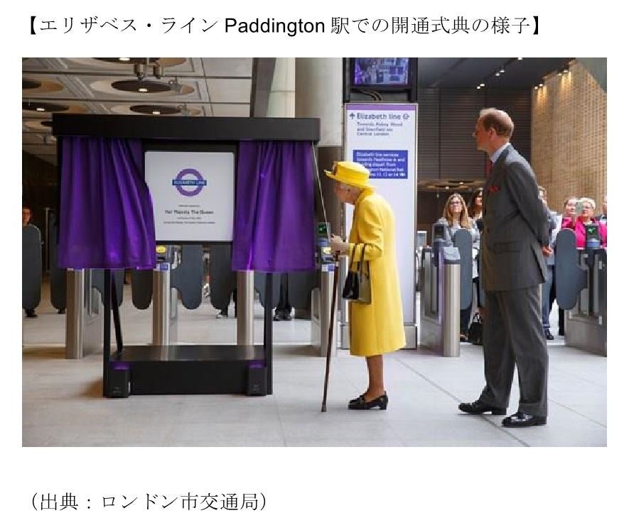 エリザベス・ラインは故エリザベス女王在位70周年の年に開通することを記念してその名を冠した路線であり、ロンドン西部に位置するヒースロー空港とロンドン中心部を経て東部をつなぐ路線長117 km、41駅を有する地下鉄路線(下記参考資料参照)です。東西に分かれていた路線が、新規建設された区間によって接続され、総工費£18.9 billion(約3.8兆円)をかけて2022 年5 月に全線開通されました。開通式典に故エリザベス女王が出席するなど、ロンドンを代表する最も新しい地下鉄です。2023年は2.1億人以上が利用した英国内で最も乗客数が多い路線の1つであり、2030 年には年間利用者が2.5億人を超える見込みです。
