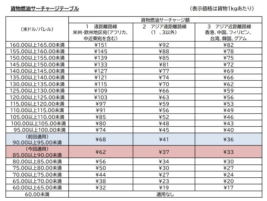 JALは、2025年5月1日から適用となる日本発国際貨物燃油サーチャージを国土交通省へ申請しました。基準となる2025年3月のジェット燃料の平均価格が1バレル当たり85.39米ドルであったことから、燃油指標価格を「85.00以上90.00未満」とし、サーチャージ額は1kgあたり62円(米州・欧州など遠距離路線)、37円(アジア遠距離路線)、33円(アジア近距離路線)となります。
