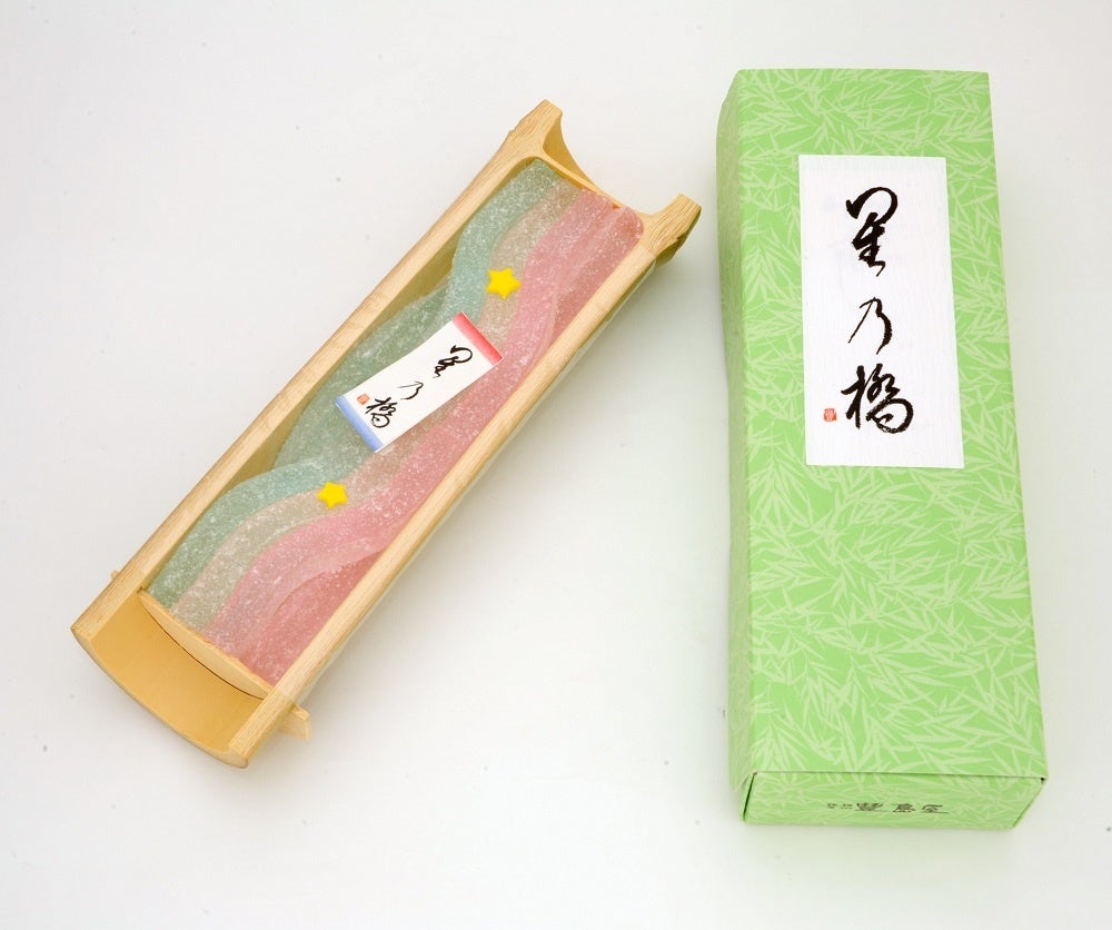 天の川を錦玉で、織姫彦星を雲平であらわした和菓子です。