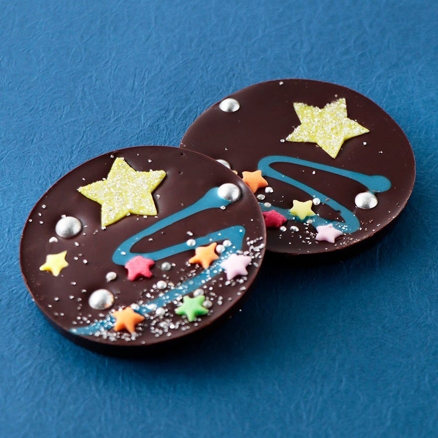 七夕の夜空をデザイン。ベルアメールオリジナルのビターチョコに、天の川をイメージした青いラインやカラフルな星をデコレーション。