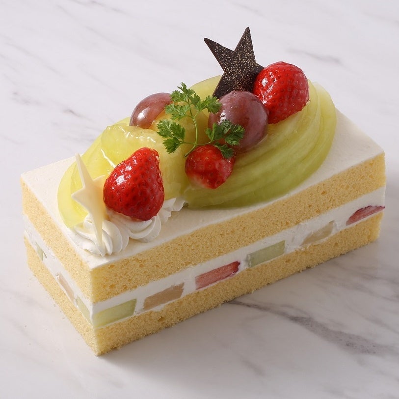 メロン、苺、洋梨をサンドしたショートケーキ。星モチーフのチョコレートをトッピングしました。