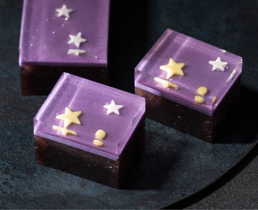 夏の夜に輝く星を透きとおる琥珀羹にとじこめ、風味豊かな小倉羹と合わせた二層羊羹。