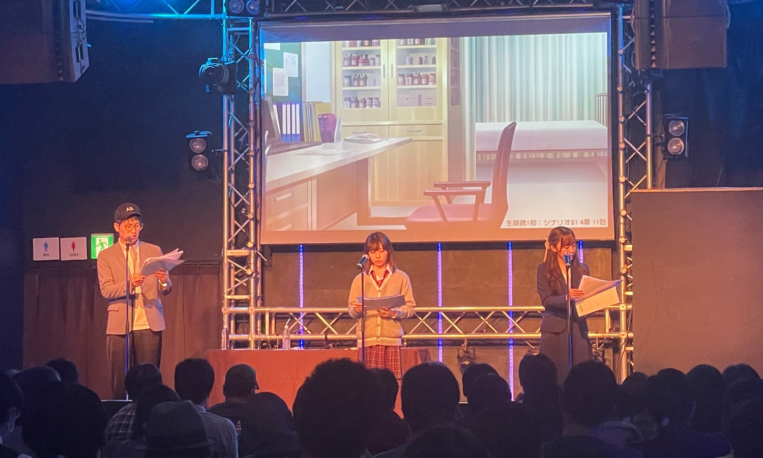 お便りコーナーが終了すると、朗読劇の時間に!主人公役・谷口悠さんも登壇し、アプリ中で配信されている本編シーンのほか、本イベント限定のオリジナルストーリーが朗読されました。また、劇中のデートシーンでは、主人公の名前を来場したファンの名前に変えて読み上げるなどの演出もなされ、その場にいたファンの方々を大いに盛り上げました!