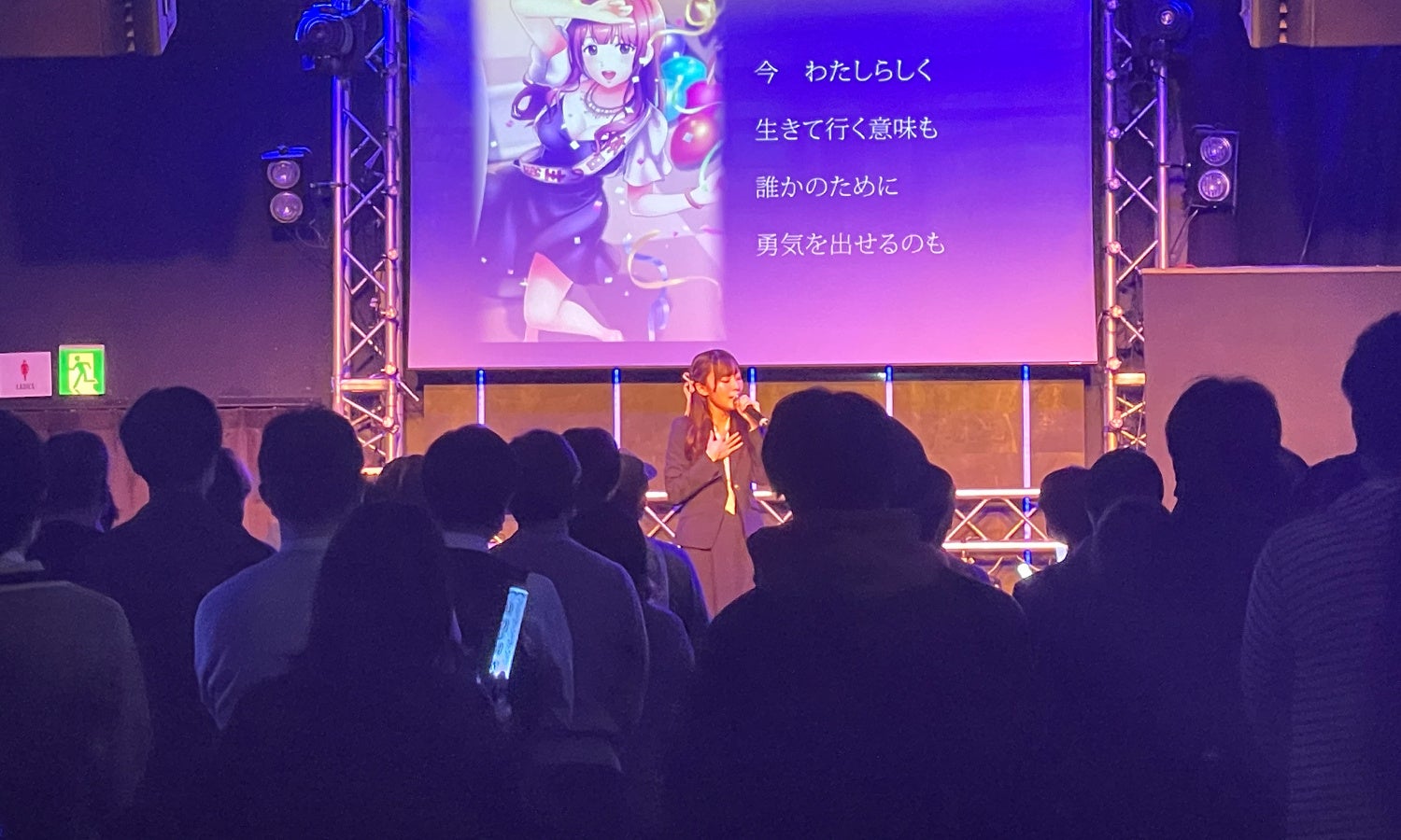 朗読劇を終えると、いよいよライブパートへ突入!お客様も立ち上がり、会場が熱気に包まれました。1曲目は、鬼川ナツのキャラクターソング「世界に拳を突き上げろ」が田辺さんの生歌で披露。手拍子のほか、間奏中には声援も入り、一体感のあるライブとなりました!2曲目の、東方ユウキのキャラクターソング「花束に咲く小さな花」では、石飛さんの優しい歌声に、観客全員が聞き入り、暖かい空気に包まれました。