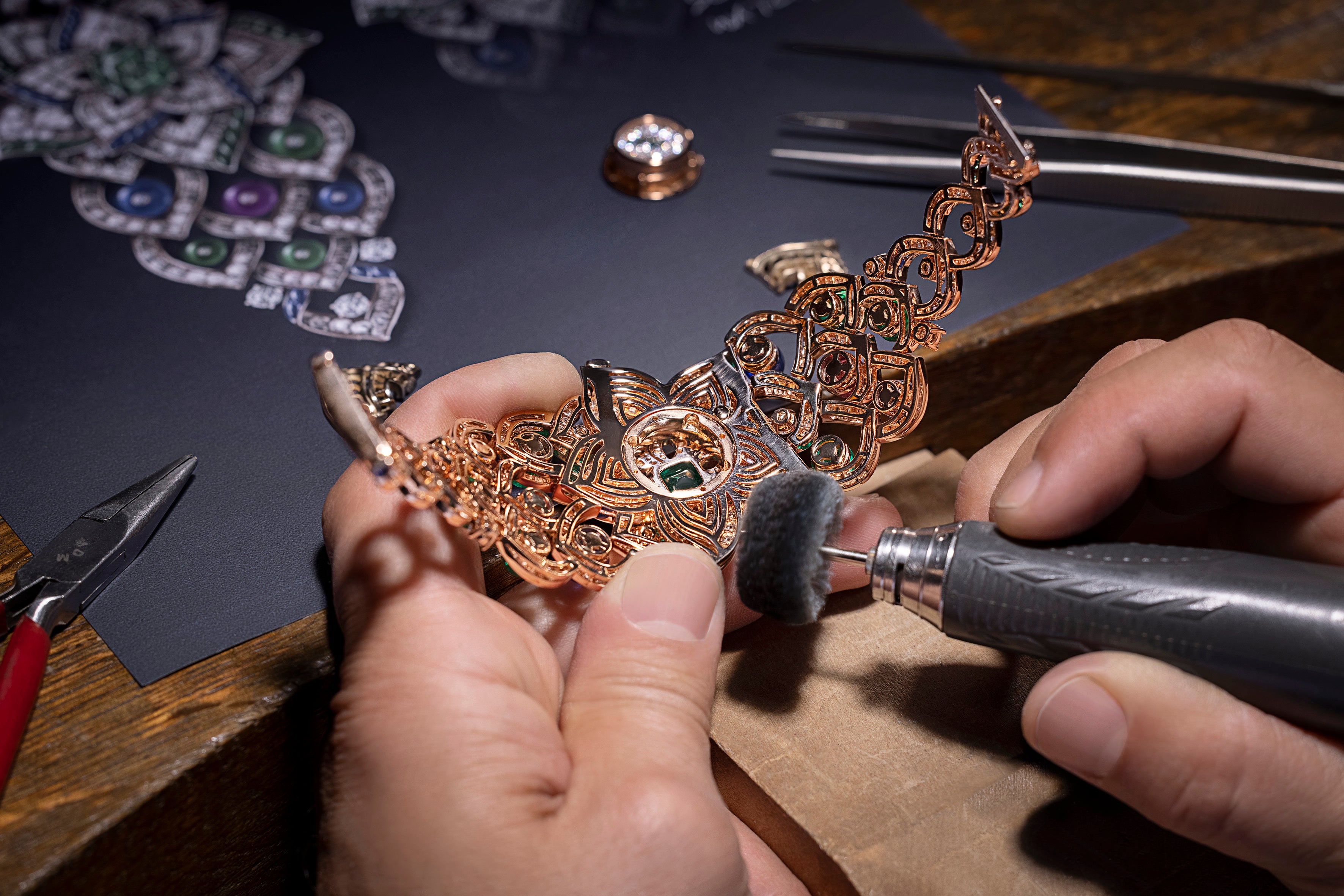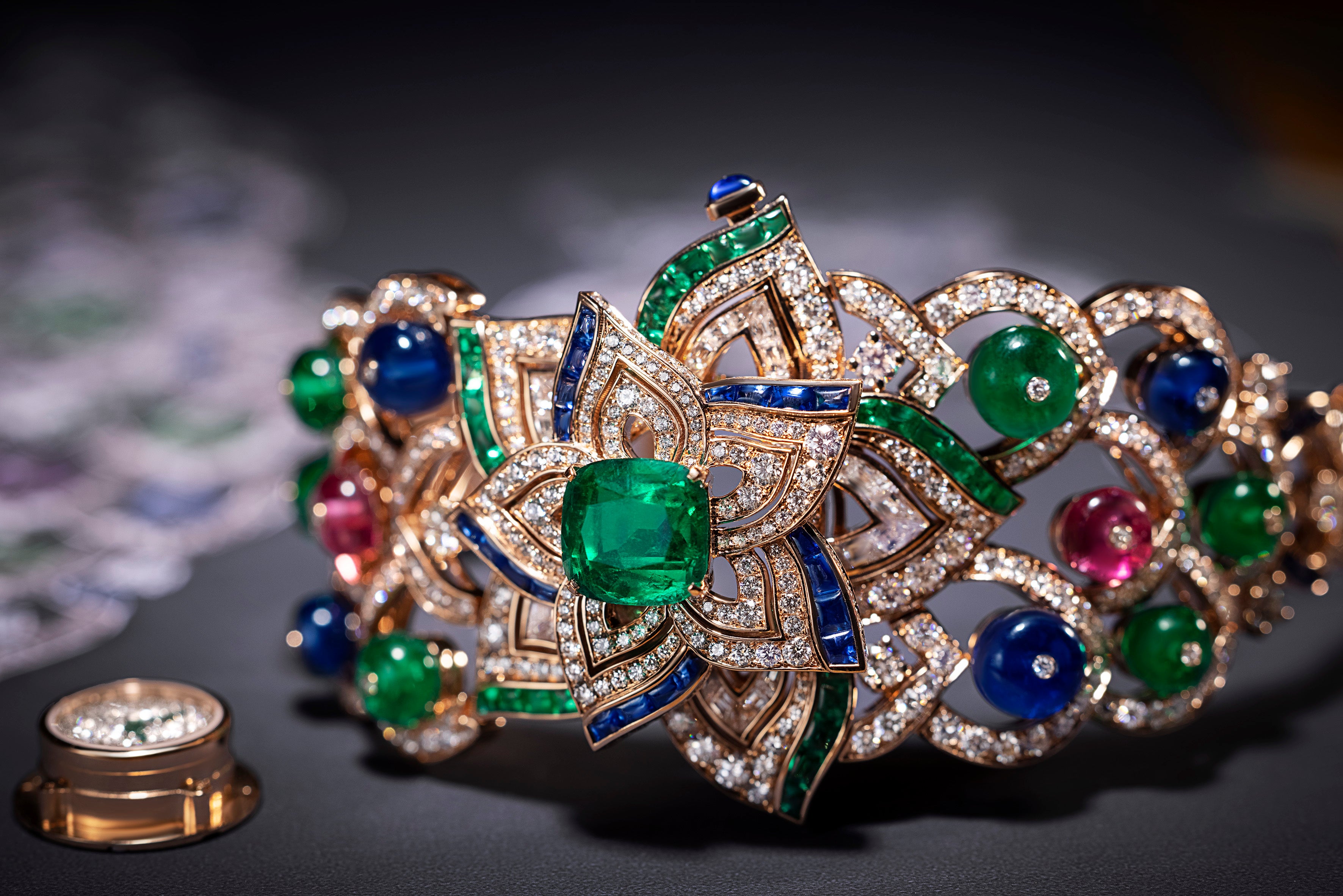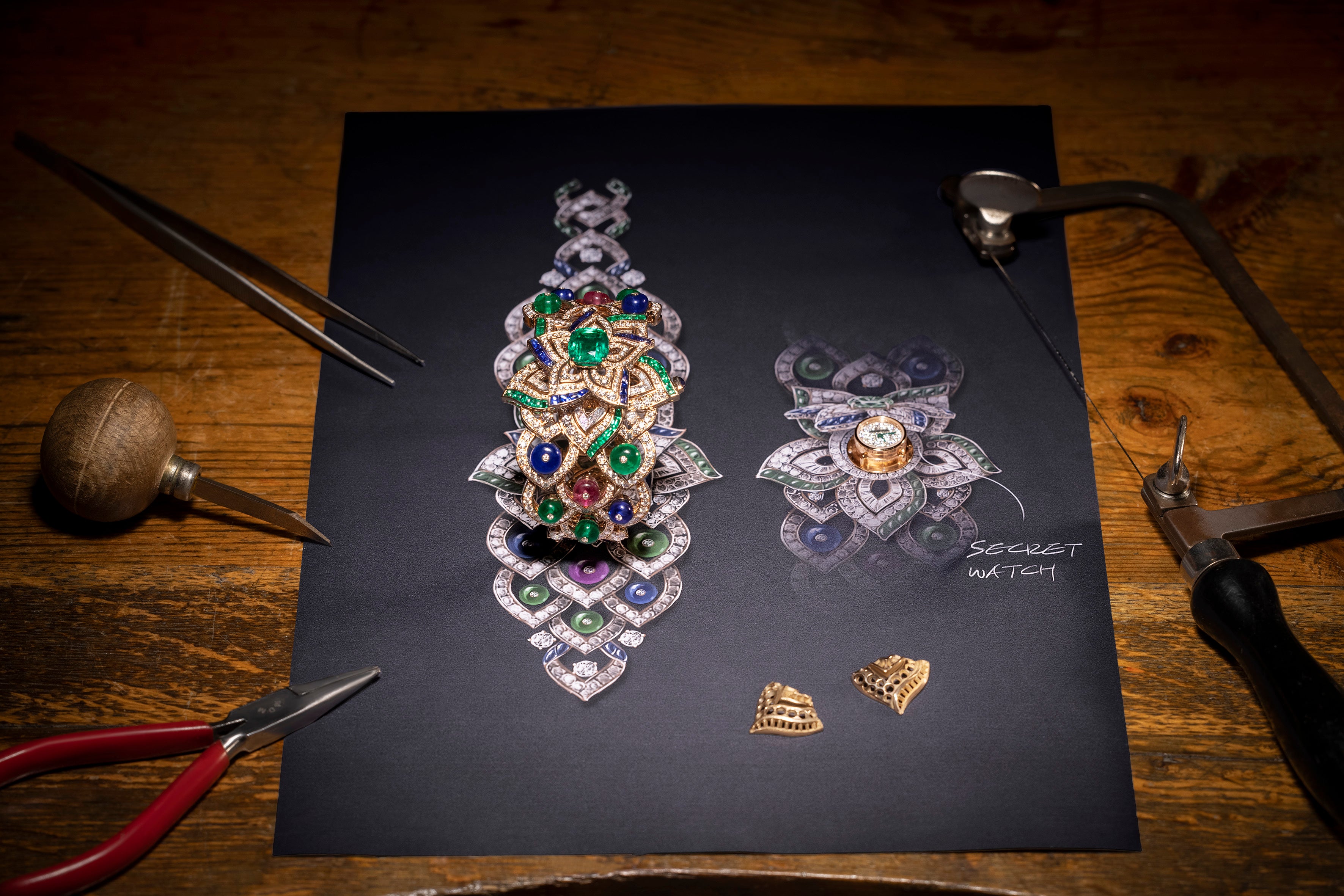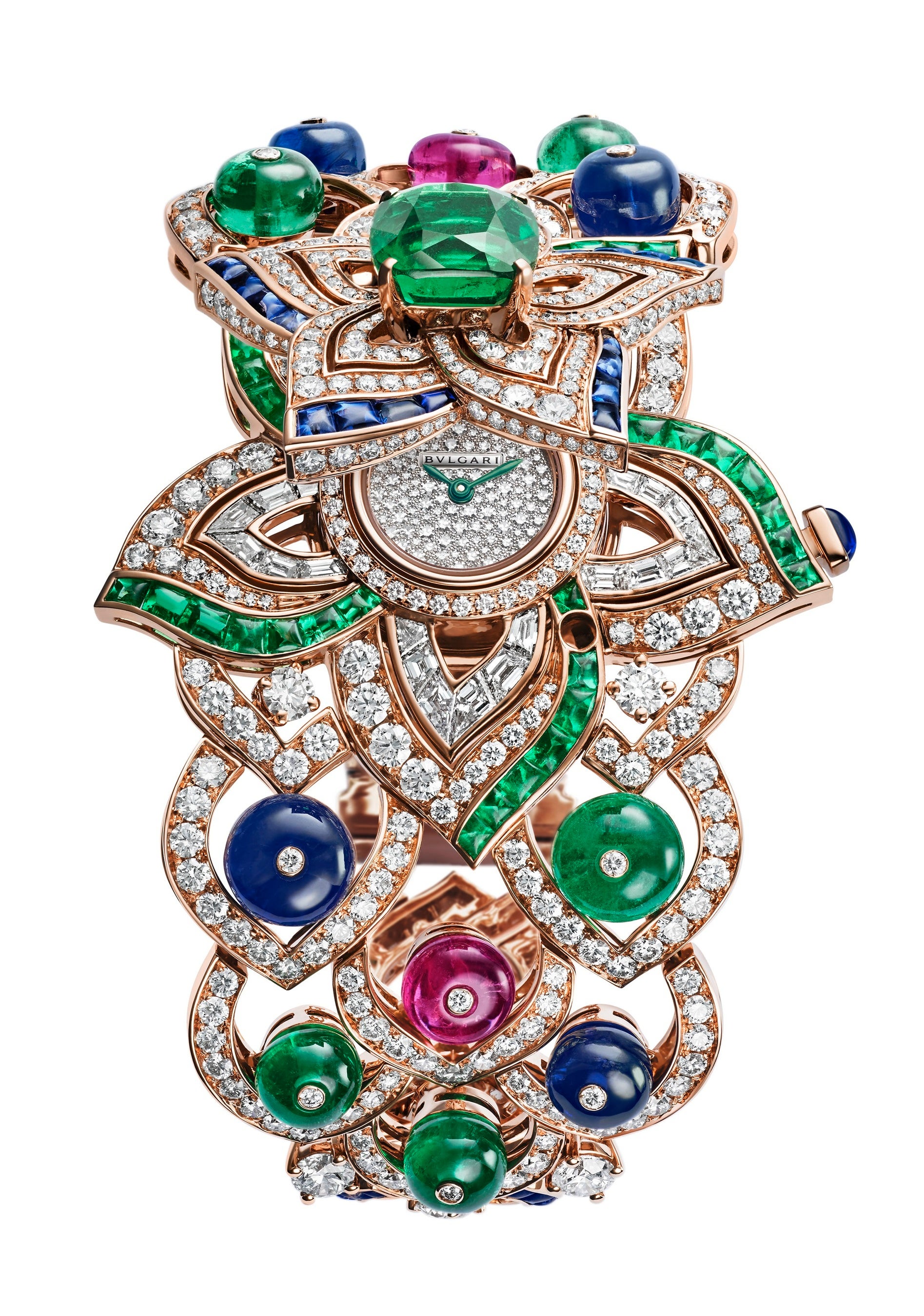 今回のコレクションでは「西洋と東洋の出会い」のテーマのもとにふたつの文化が 融合しています。「オリエンタル バズ シークレットウォッチ」は、同じデザインのネックレスとセットになっており、ビザンツ建築からアイデアを得た左右対称の幾何学模様を描くことで緑豊かな異国情緒あふれる庭園を想起させます。生命力とエネルギーに満ちあふれたこの比類なきタイムピースは製作に900時間をも要し生命力にあふれた鮮やかな表情を見せるダイヤモンド、トルマリン、エメラルド、サファイアのビーズの見事なコンビネーションが特徴です。シークレットウォッチは インドのムガル風モチーフを描くパヴェダイヤモンドに嵌めこまれた約5.65カラットのコロンビア産クッションカットエメラルドが主役になっています。中央にあしらわれたエメラルドを押すと花が開き、輝くダイヤモンドが施されたダイヤルが現れます。