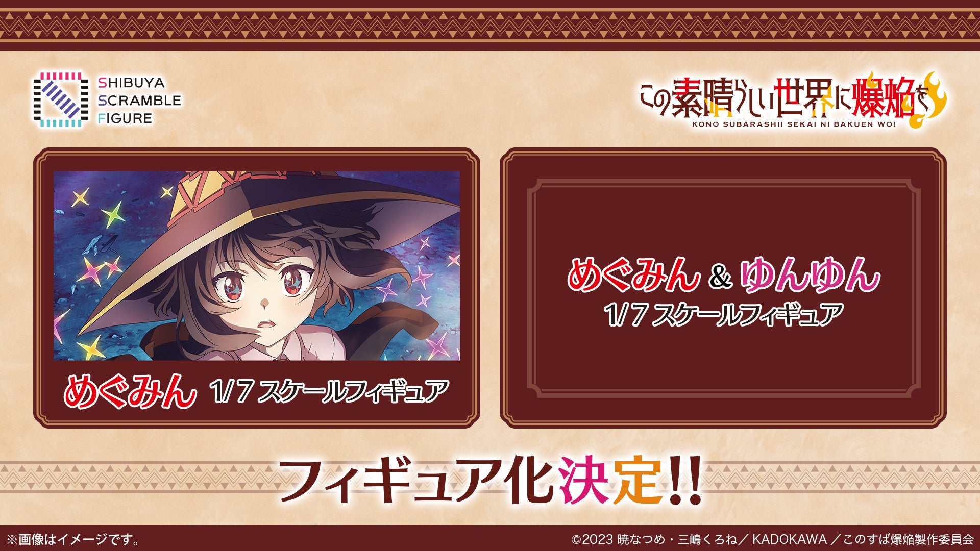 株式会社CyberZ(本社:東京都渋谷区、代表取締役社長:山内隆裕)の連結子会社、株式会社eStream(本社:東京都渋谷区、代表取締役社長:高井里菜)が手掛けるフィギュアブランド「SHIBUYA SCRAMBLE FIGURE」(通称「渋スクフィギュア」)は、アニメ『この素晴らしい世界に爆焔を!』より、「めぐみん」・「めぐみん&ゆんゆん」の1/7スケールフィギュア化を決定いたしました。発売日などの詳細は随時発表いたします。