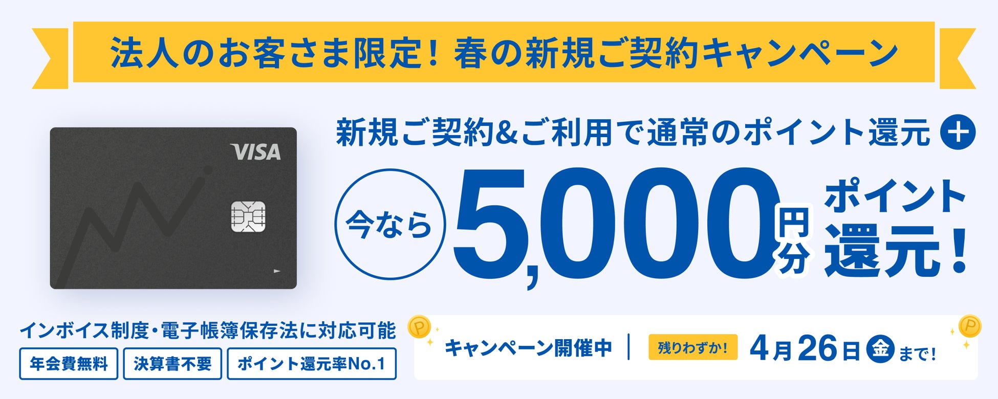 2024年3月1日(金)から2024年4月26日(金)までの期間、『マネーフォワード ビジネスカード』を新規で契約・利用した法人事業者に、5,000円分のポイントをプレゼントします。ポイントはVisa加盟店での決済で利用可能です。詳しい支給条件などの詳細はキャンペーンサイトをご覧ください。