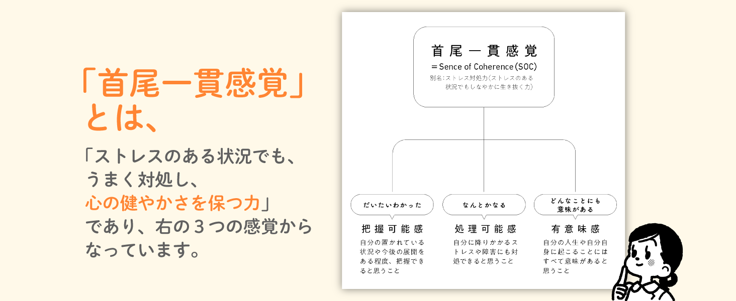 首尾一貫感覚とは、「ストレスが高い状況にあっても、それにうまく対処して、心の健やかさを保てる力」のことです。