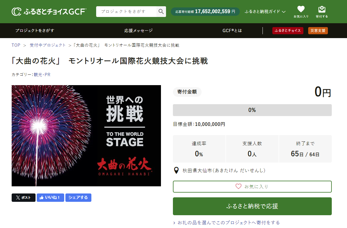 秋田県大仙市とふるさとチョイス、ふるさと納税制度を活用したガバメントクラウドファンディング®で、国際的な花火競技大会への挑戦費用および日本の花火を海外展開するための費用を募るプロジェクトを開始