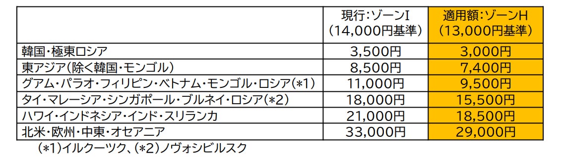 1) 2025年6月1日(日)から7月31日(木)までの発券分については、今後の航空燃油価格の水準にかかわら ず、上記適用額からの変更は原則行いません。