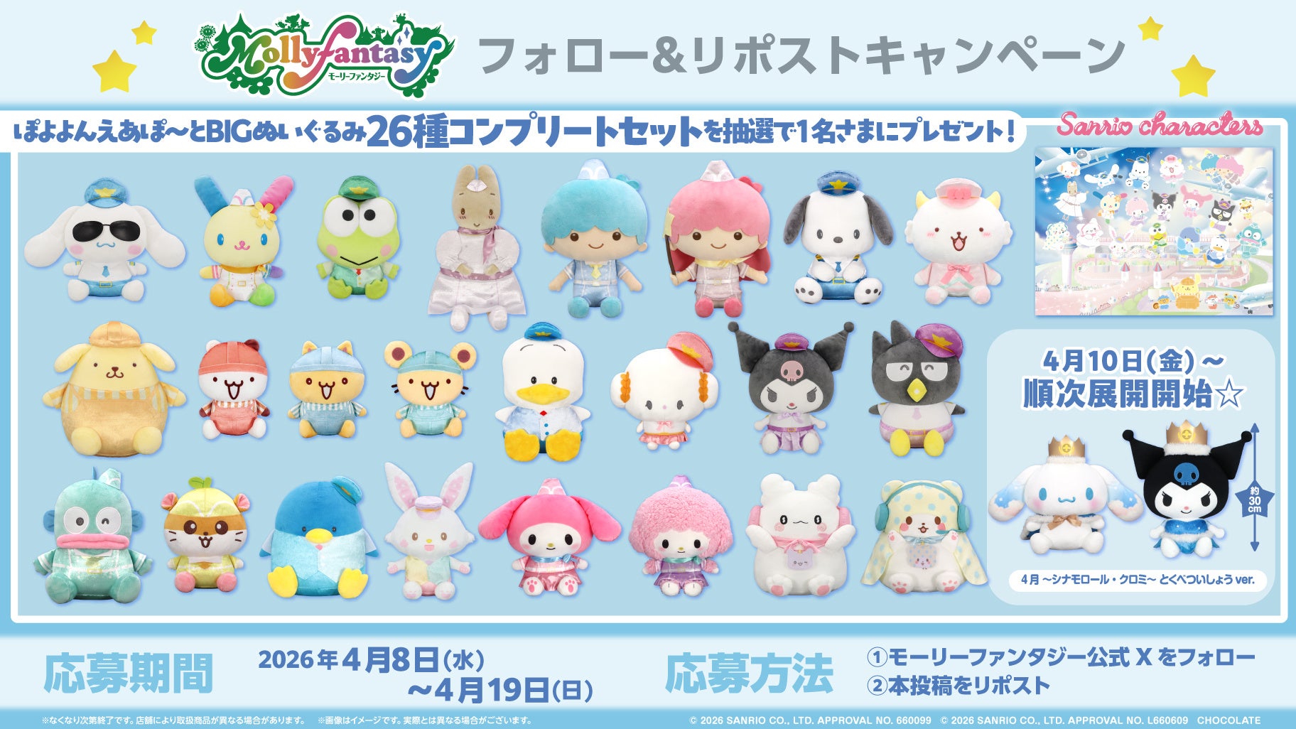 『サンリオキャラクターズ ぽよよんえあぽ~と』シリーズ最終弾!お空をイメージした「とくべついしょう」を着た「シナモロール」と「クロミ」の「BIGぬいぐるみ」が4月10日(金)より展開開始