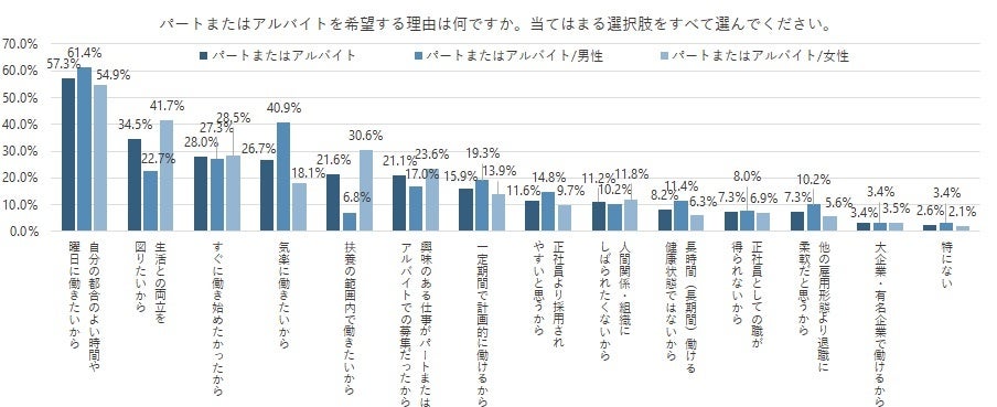 「自分の都合の良い時間や曜日に働きたいから」57.3%、「生活との両立を図りたいから」34.5%、「すぐに働き始めたかったから」28.0%