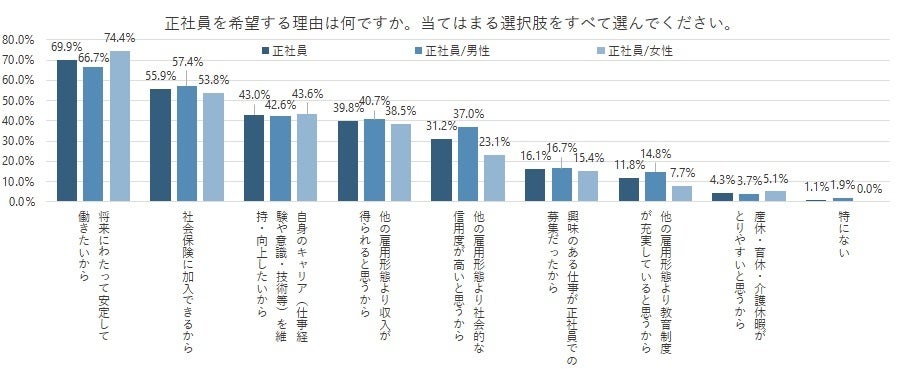 「将来にわたって安定して働きたいから」69.9%、「社会保険に加入できるから」55.9%、「自身のキャリア(仕事経験や意識・技術等)を維持・向上したいから」43.0%