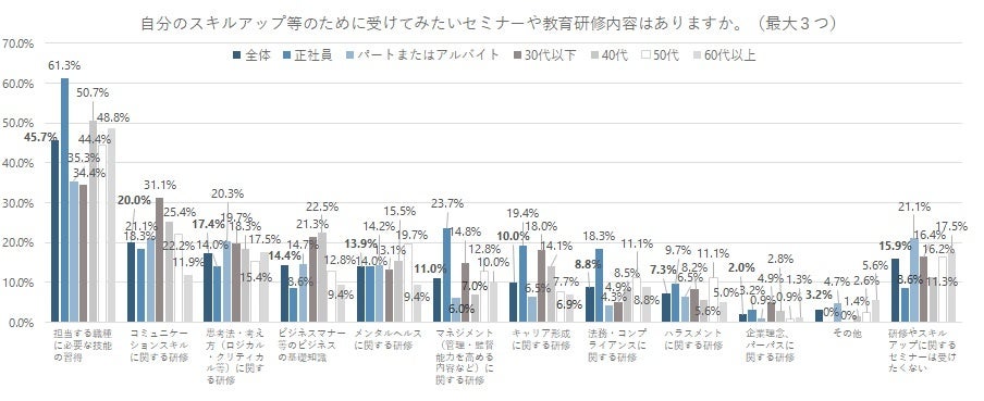 今回の調査では、自分のスキルアップ等のために受けてみたいセミナーや教育研修があるかどうか聞きました(最大3つ)。最も多かったのは「担当する職種に必要な技能の習得」の45.7%、特に正社員希望者については61.3%となりました。希望の雇用形態や求職者の年代によって、受けてみたい研修に差があります。貴社の教育研修企画の参考になれば幸いです。