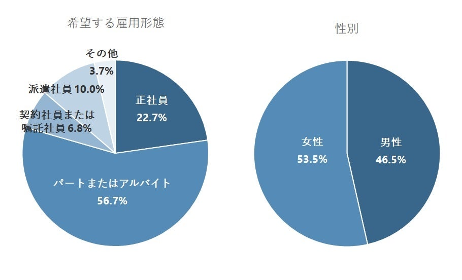 性別との関係をみると、「女性」よりも「男性」の方が「気楽に働きたいから」が22.8pt、「自分の都合のよい時間や曜日に働きたいから」が6.5pt、「一定期間で計画的に働けるから」が5.4pt高くなった。心や体の負担の軽い状態で働きたいと考えている人が多くなっている。 一方、「女性」のほうが「男性」よりも「扶養の範囲内で働きたいから」が23.8pt、「生活との両立を図りたいから」が19.0pt、「興味のある仕事がパートまたはアルバイトでの募集だったから」が6.6pt高くなった。今の生活のリズムを保ちつつ、ある程度の収入を得たいと考えている人が多いようだ。