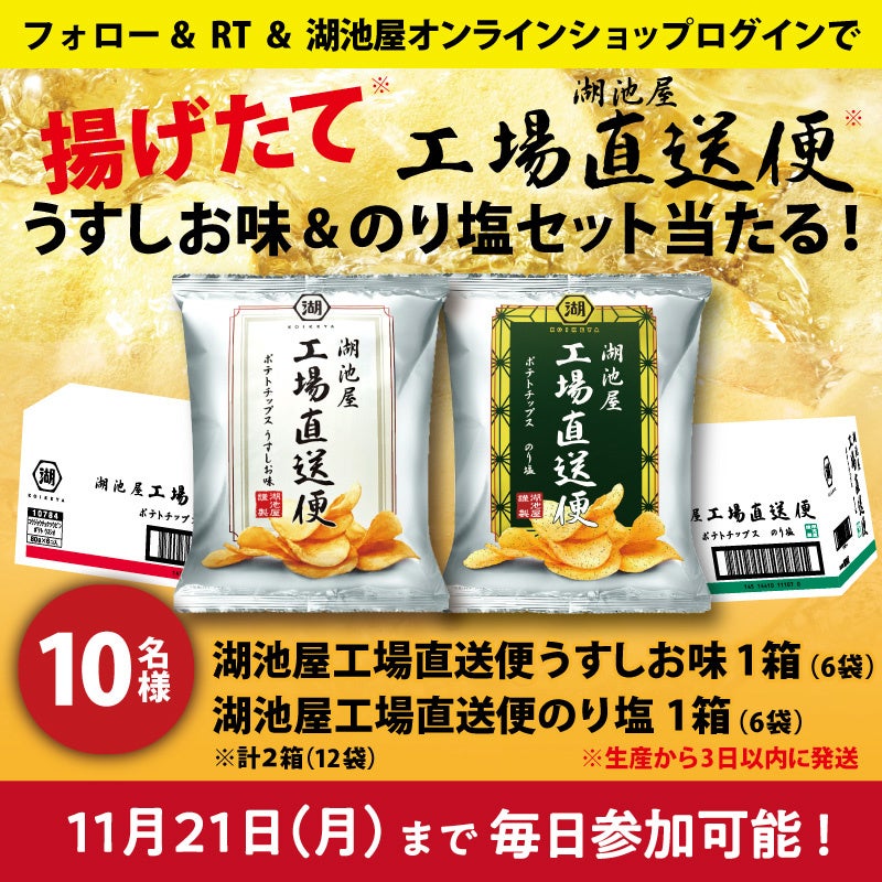 「湖池屋 工場直送便 ポテトチップス」シリーズは、その揚げたて新鮮な風味と食感をご評価いただき、完全受注生産という販売形態をとりながらも、おかげさまで累計500万食を突破しました。この度、いつも「湖池屋 工場直送便 ポテトチップス」をご愛顧いただいているお客様への感謝の気持ちを込めるとともに、まだお召し上がりいただいていない方にも一度お試しいただきたいとの思いから、「工場直送便 ポテトチップス」2品各1箱をセットにしてプレゼントするキャンペーンを実施します。Twitterでのフォロー&リツイートと、湖池屋オンラインショップへの会員登録のみで簡単にご応募でき、はずれてもオンラインショップで使用できる割引クーポンをプレゼントしておりますので、この機会にぜひご登録・ご参加ください。