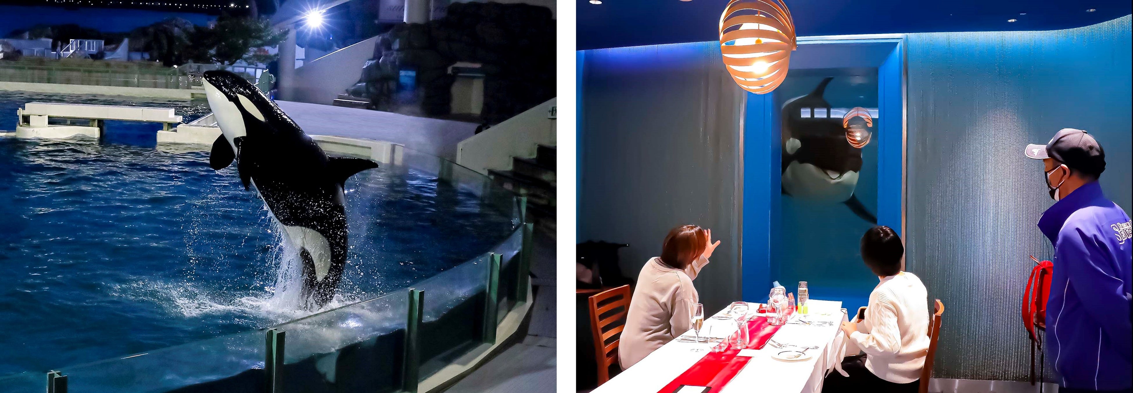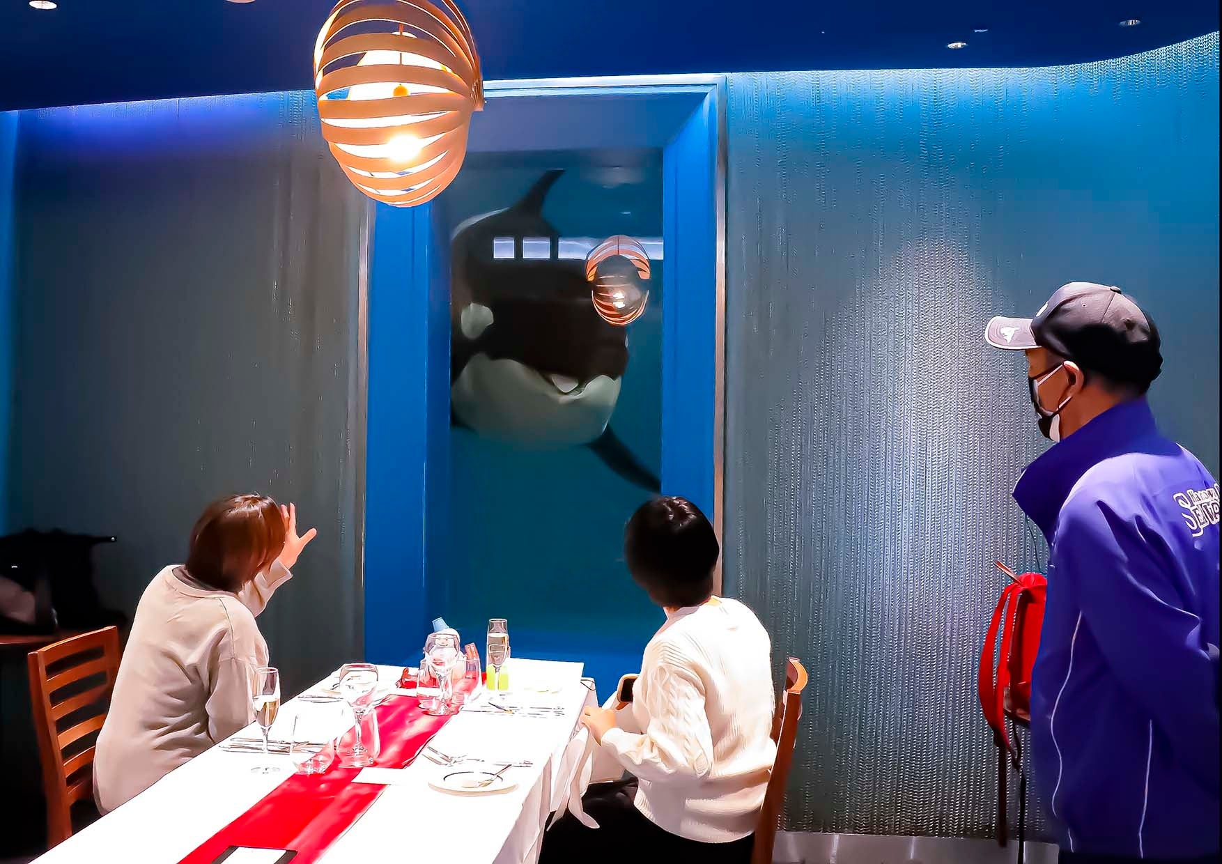 ※お食事中に、目の前の観覧窓からシャチがご挨拶 シャッターサービス実施