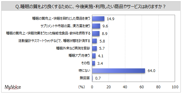 睡眠の質を良くするために利用したいものは「睡眠の質向上・快眠を目的とした商品」が約15%