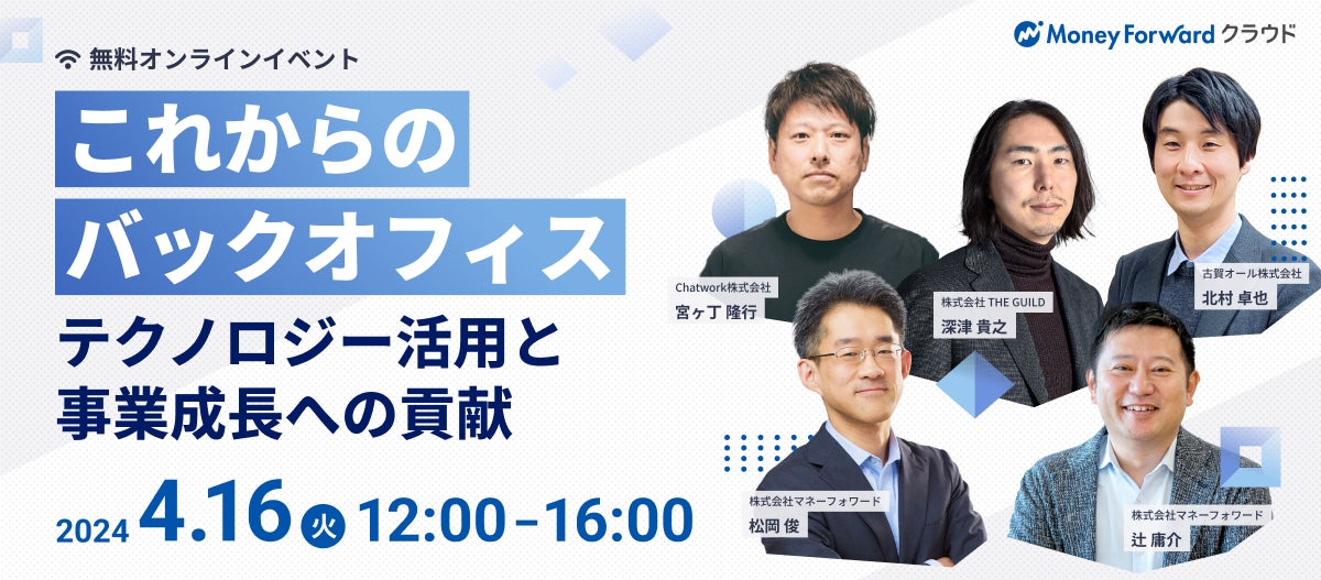 株式会社マネーフォワードは、4月16日(火)に、中小・スタートアップ・中堅企業の経営層、コーポレート部門(主に経理部門)の担当者、経営企画やDX推進室の担当者に向けたオンラインイベント『これからのバックオフィス〜テクノロジー活用と事業成長への貢献〜』を開催します。