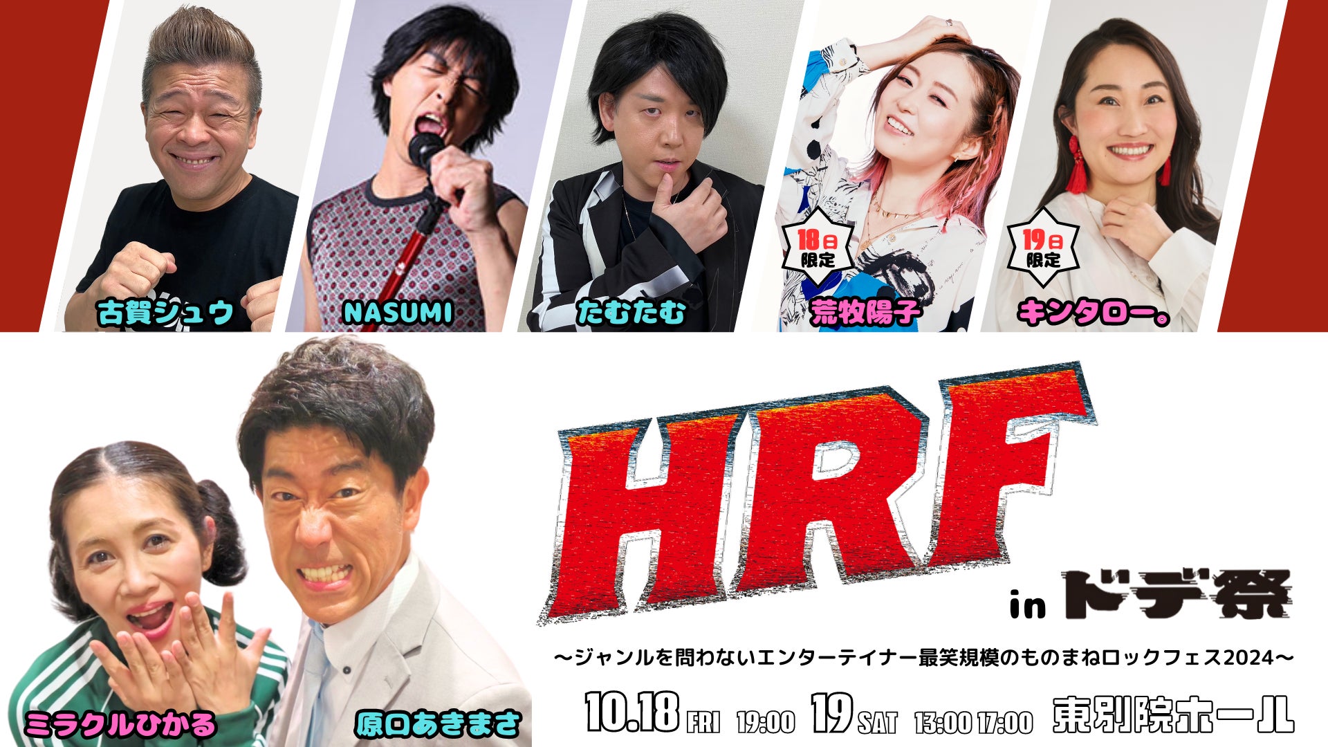 HRFとは、原口あきまさ・ミラクルひかるが企画するフェスで、ものまねのスペシャリストたちが、お笑い、音楽など、さまざまなエンタテインメントをステージで繰り広げます。2023年11月に東京で初演され大好評を博し、今回、満を持して名古屋で初開催いたします。