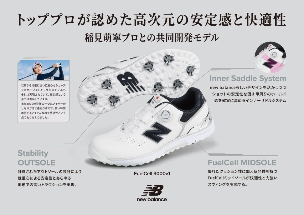 高次元の安定感と快適性を兼ね備えた本モデルの最大の特徴は、ニューバランスのキーテクノロジー「FuelCell」をミッドソールに取り入れ、優れたクッション性と反発性が快適性を実現。また計算されたアウトソール設計により、稲見プロが求める低重心化を達成し、スイング・歩行時の安定感とあらゆるライでの高いグリップ力を実現しました。