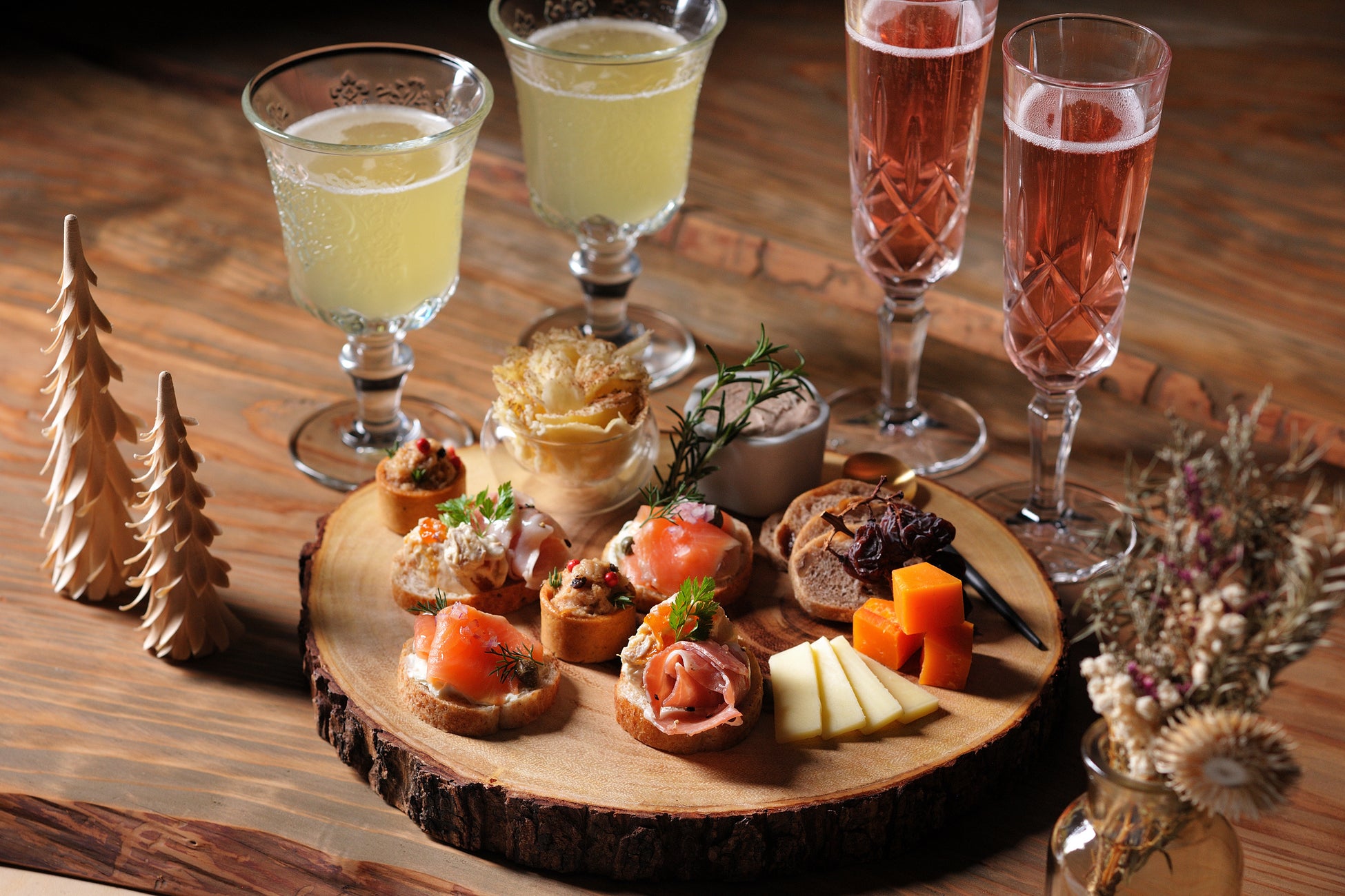 標高1319mの天神平へ向かう上りロープウェイでは、チロルのエッセンスを取り入れたアペタイザーを提供します。ヨーロッパの山岳地方では、冬になると深い雪に閉ざされるため、干し肉やチーズ、パンなど保存食の文化が発達しました。この地の食文化に着想を得て、アペタイザーでは、サラミやリエット、チーズにライ麦パンを組み合わせ、さらに日本の冬の風物詩である干し柿を添えた、フィンガーフードを提供します。ドリンクには、スパークリングワインや、冬の味覚であるりんごジュースを用意しています。