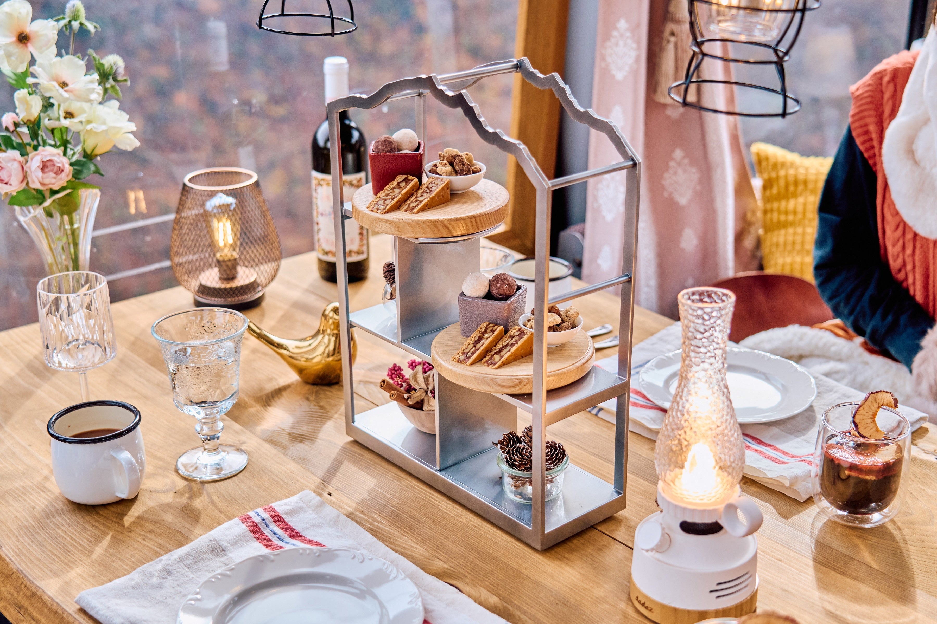 下りのロープウェイでは、スイスの伝統菓子エンガディナー(ヌガーをからめたくるみをクッキー生地で包み込んだお菓子)に着想を得たスイーツや、スイスで冬に親しまれているくるみやチョコレートを使ったスイーツを提供します。スイーツのお供に、グリューワインやホットチョコレートといった温かいドリンクもおすすめです。スイーツを盛付ける、谷川岳の稜線をかたどった特製スタンドは写真映え間違いなし。雪山を眺めながら心ゆくまで何周でもゴンドラの空中遊覧を楽しめます。