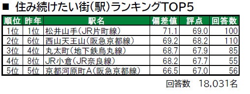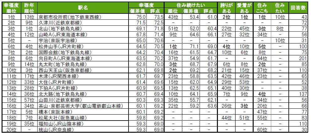 京都市中京区に位置する京都市役所前が、昨年13位から順位を上げて1位に輝きました。京都市役所前は、「住みここち(駅)」でも1位となっています。2位は、城陽市に位置する久津川で、昨年9位から順位を上げました。3位は、京都市左京区に位置する北山です。トップ10内では、初登場の宇治市に位置する宇治が5位で、昨年は累計回答数が30名未満でランキング集計対象外でした。