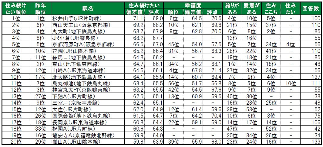•駅ランキング:5位宇治(京阪宇治線)、20位桃山(JR奈良線)は、2020年~2024年の累計回答数が30名未満で、「住み続けたい」「誇りがある」「愛着がある」ランキングの集計対象外となっているため、「-」と表示しています。