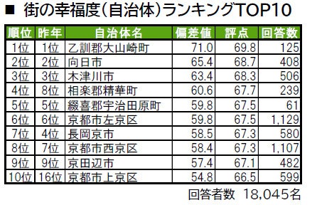 ■街の幸福度(自治体)トップは、4年連続で乙訓郡大山崎町