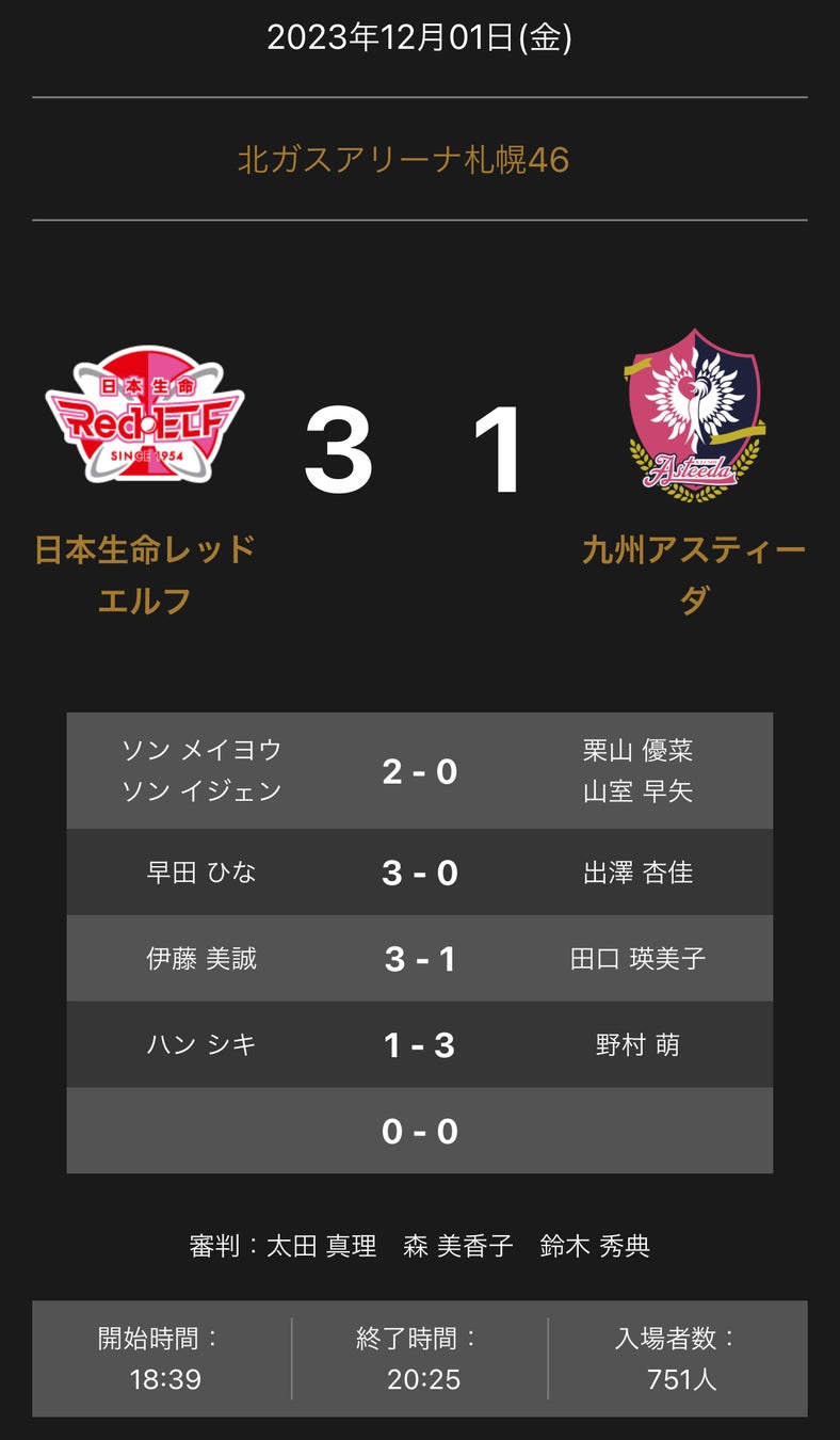 ノジマTリーグ2023-2024シーズン公式戦 12月1日(金)18:30試合開始 日本生命レッドエルフvs 九州アスティーダ 試合結果