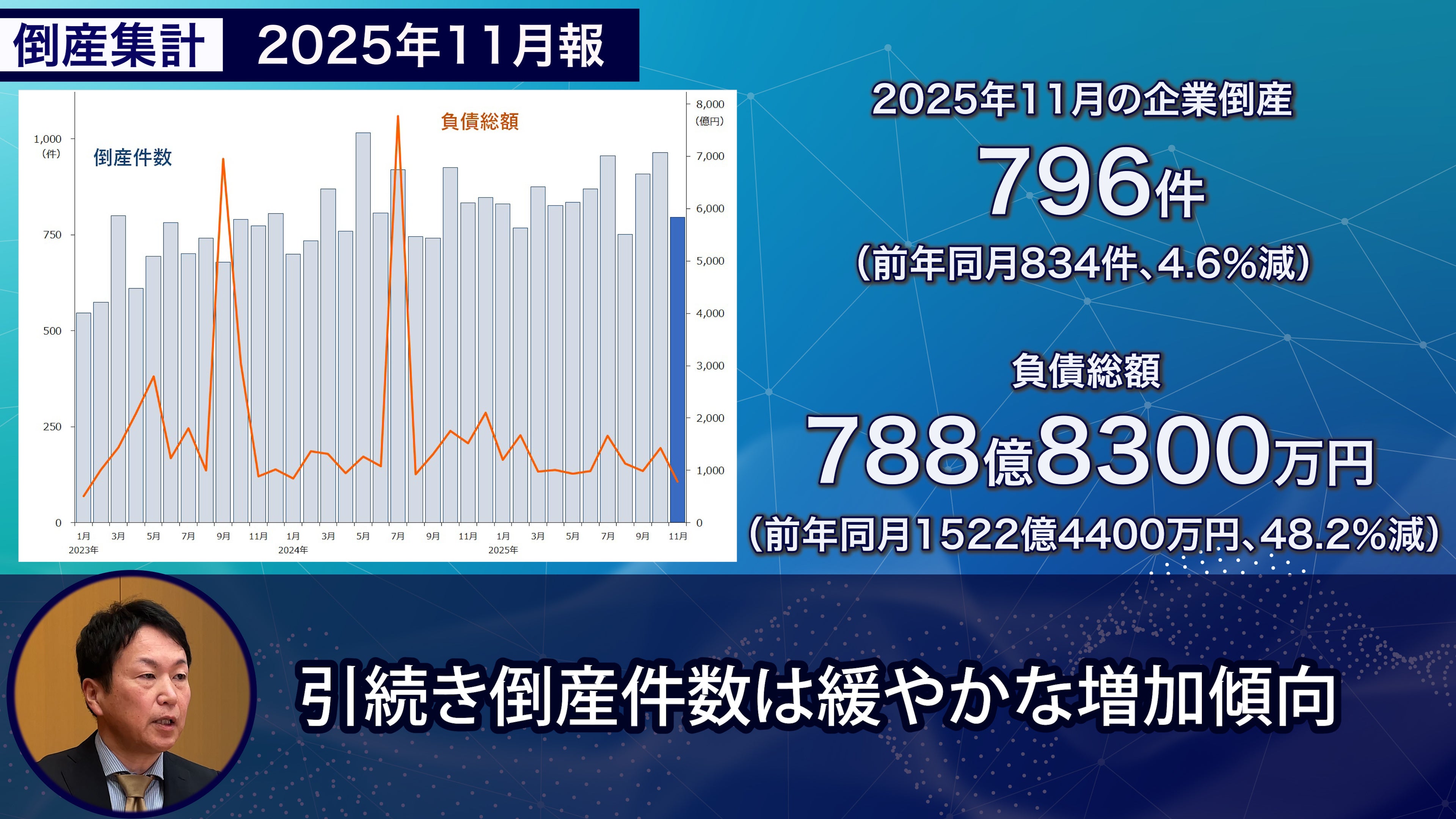 2025年11月の倒産件数は796件(前年同月834件、4.6%減)となった。6カ月ぶりに前年を下回った。1~11月の累計は9380件(前年同期9053件、3.6%増)で緩やかな増加傾向が続く。