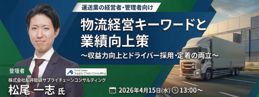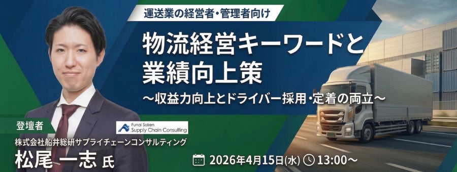 株式会社船井総研サプライチェーンコンサルティング(本社:東京都中央区、代表取締役社長:橋本直行、以下「船井総研SC」)は、2026年4月15日(水)に開催される、株式会社新出光様が主催するオンラインセミナー『物流経営キーワードと業績向上策』にゲスト講師として登壇いたします。