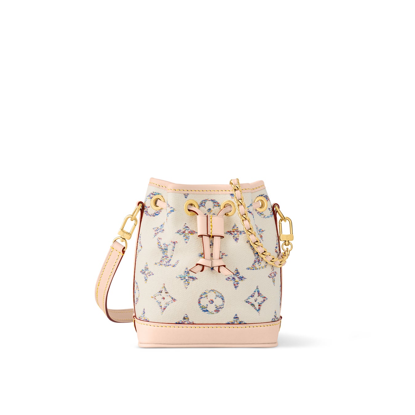 ツイードのような風合いのモノグラム・ジャカード素材を使用した、特別エディションの「ナノ・ノエ」。アイコンバッグ「ノエ」をミニチュアサイズにアレンジし、底の部分やドローストリング、取外し & 調節可能なショルダーストラップはヌメ革で仕上げました。取外し可能なハンドルには、ゴールドカラーのチェーンが編み込まれています。※実際の製品は画像と一部仕様が異なります。