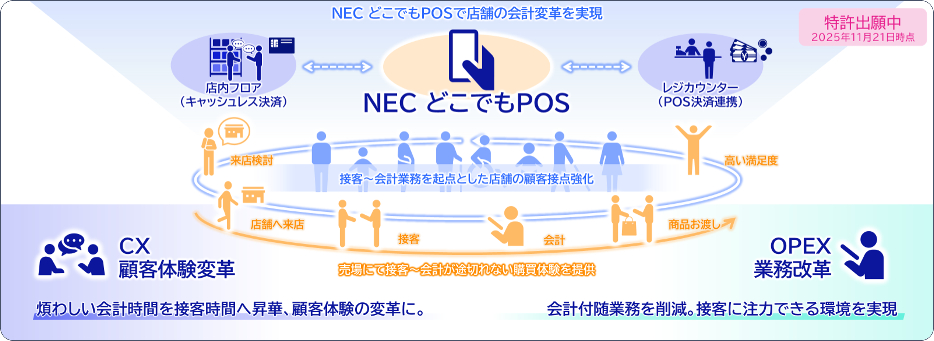 NECは、長年にわたり小売業の業務を支えてきた知見を活かし、これらの課題を解決する「NEC どこでもPOS」を開発しました。
