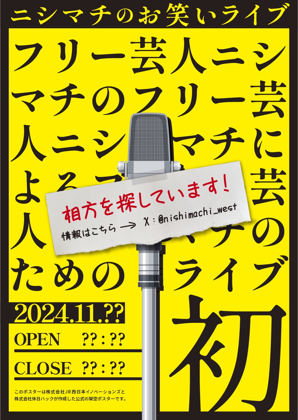 “フリー芸人「ニシマチ」”西のXアカウントで投稿される内容をヒントに、駅周辺を探索し、町田を見つけ出してください! 見つけた方には先着でグッズをプレゼント!
