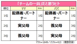 ママ・パパ共に1位は「配偶者・パートナー」となりました。ママからは「1番協力し合える人だから」「共に育児をしているという感覚がいつもあるから」、またパパからは「一緒に子育てするパートナーだから」「お互いに夫婦として支え合っている」などの声が見られました。