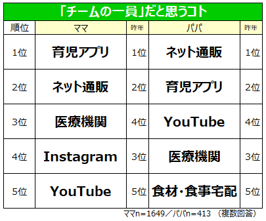 「育児アプリ」は「子どもの成長を記録できる(ママ)」「分からないことなど相談出来る場所(ママ)」「育児の記録を残せて時間管理ができる(パパ)」「有用な情報を得られるから(パパ)」、「ネット通販」は「紙おむつや粉ミルクなど、コンスタントに消費する物をよく購入する(ママ)」「外出せずに買い物ができ、重いものを運んでくれる(パパ)」などの声が寄せられました。