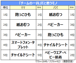 パパ1位も昨年同様に「紙おむつ」。「いつも使っているから」「絶対に必要。そして量も必要」などの声が寄せられました。また、「ベビーカー」「抱っこひも」がそれぞれ1ランクアップするなど、お出かけ関連グッズの上昇が見られました。