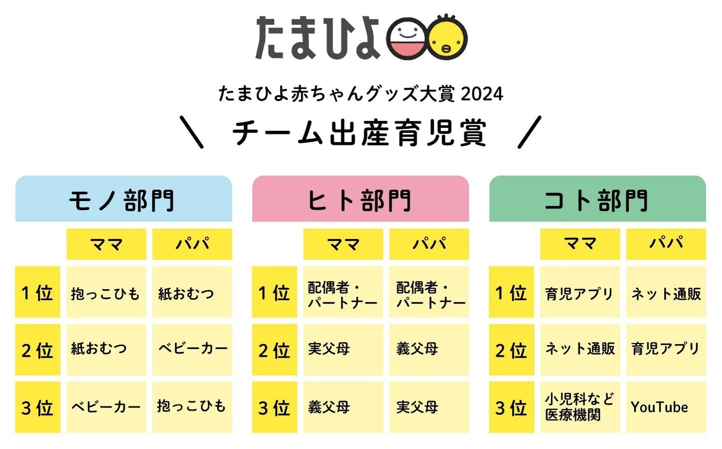 ~ママ・パパ2000人が選ぶ「第15回たまひよ赤ちゃんグッズ大賞2024」発表~ 「チーム出産育児賞」モノ部門 ママ1位は3年連続「抱っこひも」、パパ1位「紙おむつ」