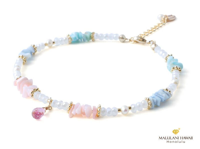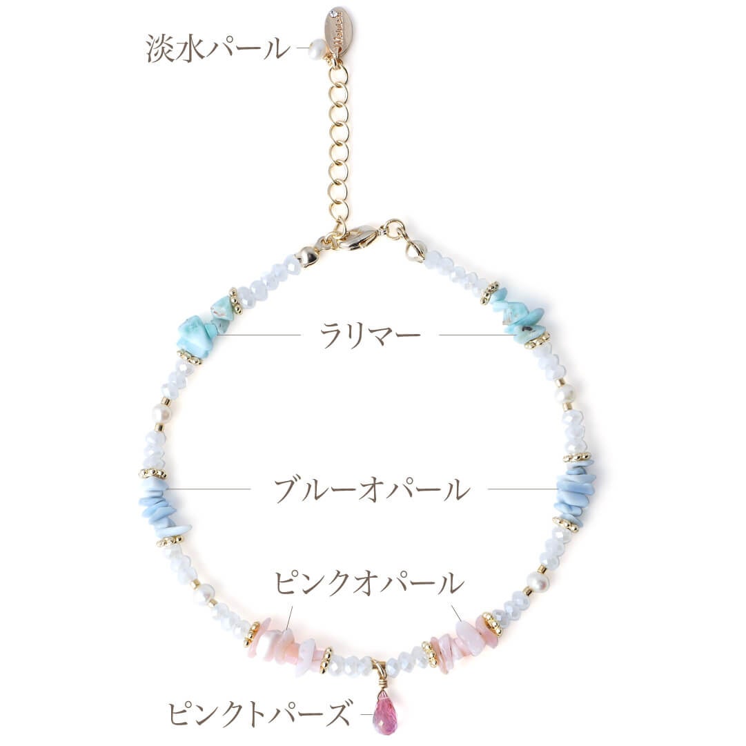 生まれ持った魅力と才能を引き出すピンクオパールとブルーオパール、愛と平和のエネルギーを宿すラリマーなど、淡く柔らかなトーンで仕立てた、プリンセス感満載のアンクレット。