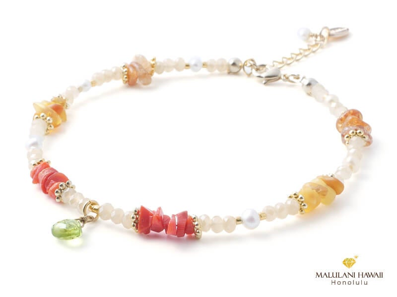 ラリマーや各色オパール、天然のコーラルやアンバーなど、ラフカットの希少な石と淡水パール、ペリドットやピンクトパーズの太陽の石をあしらい、上品に仕立てたアンクレットは、世代を問わず身に着けていただけるナチュラルな表情が魅力。