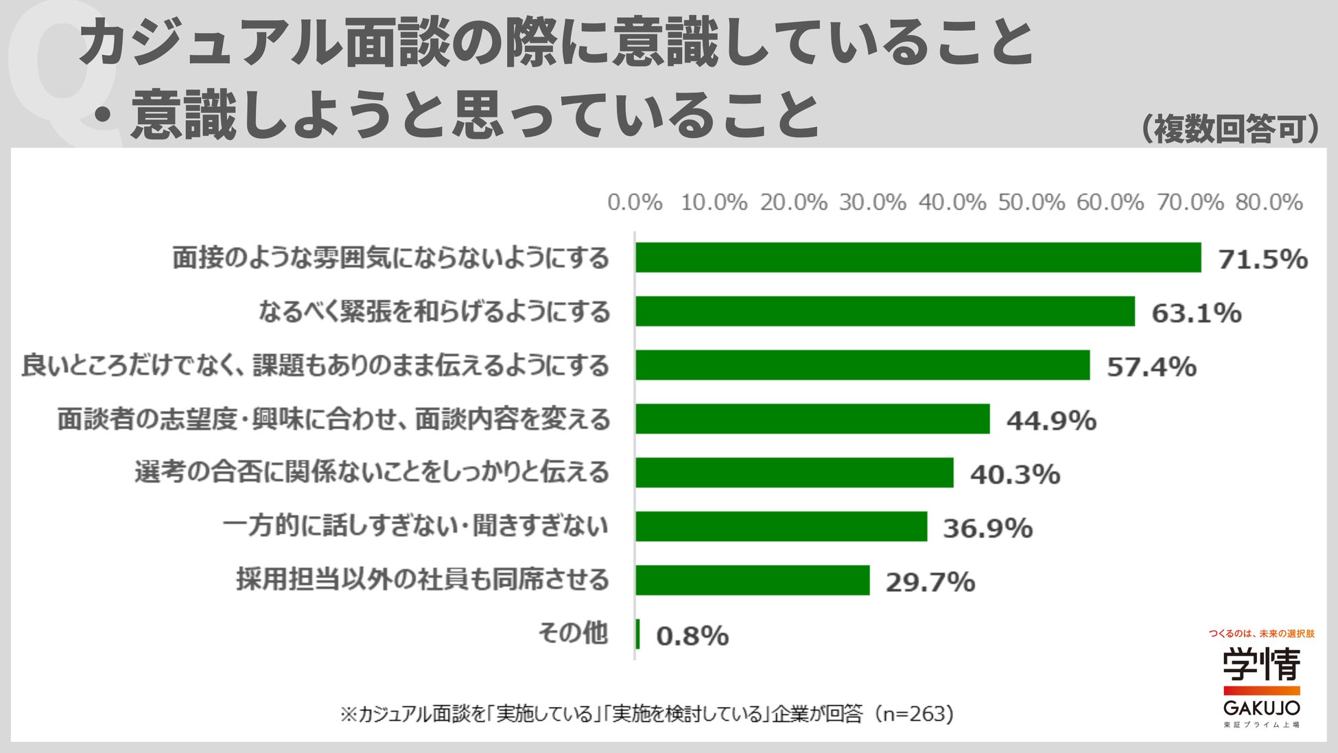 カジュアル面談の際に意識していること、意識しようと思っていることは、「面接のような雰囲気にならないようにする」が71.5%で最多。次いで、「なるべく緊張を和らげるようにする」63.1%、「良いところだけでなく、課題もありのまま伝えるようにする」57.4%が続きました。