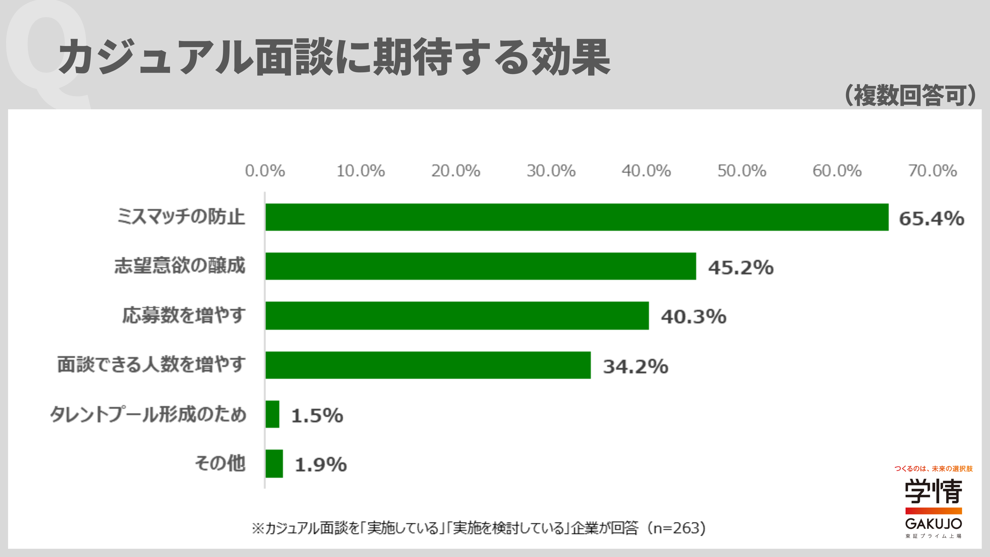 「カジュアル面談」に期待する効果は、「ミスマッチの防止」が65.4%で最多。次いで、「志望意欲の醸成」45.2%、「応募数を増やす」40.3%が続きました。