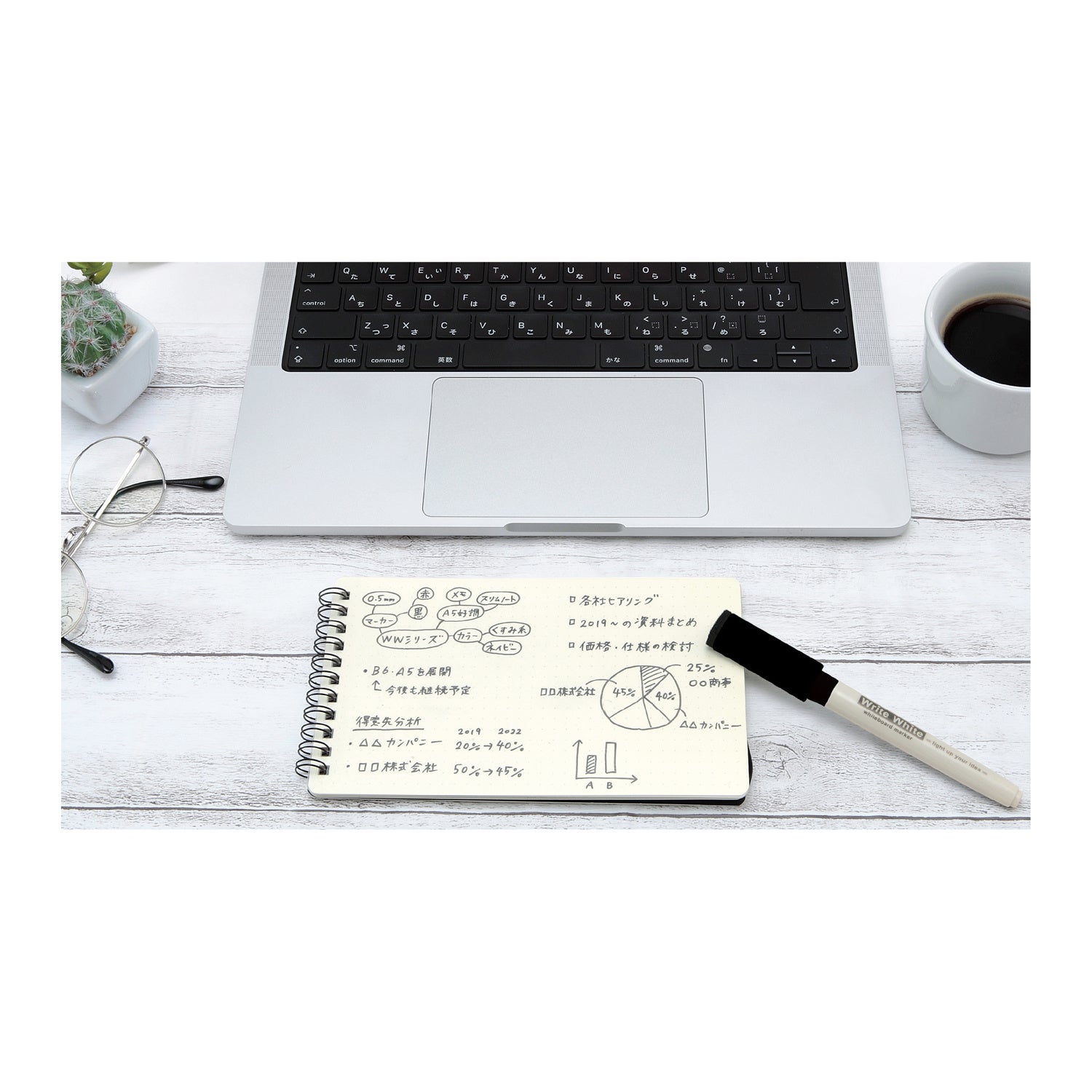 中紙がホワイトボード素材でできたノート。パソコンの前などの狭いスペースにも置きやすく、何度も繰り返し使えます。
