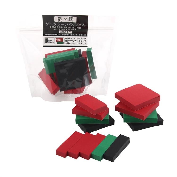 メーカーで在庫になっている紙を、使いやすいサイズの付箋にして詰め合わせたパック。ダークカラーの紙で明るい色のペンがよく映えるだけでなく、文字の目隠しなどにも。