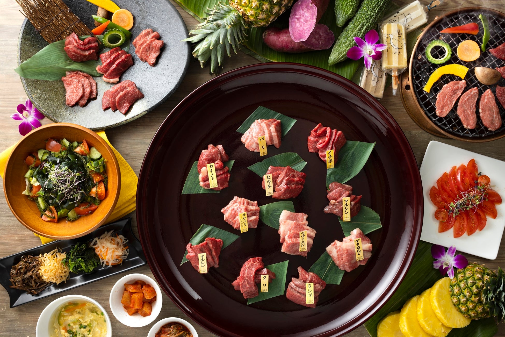 焼き野菜5種、キムチ3種、海ぶどうサラダ・国産牛&黒毛和牛 味比べコース 9,500円