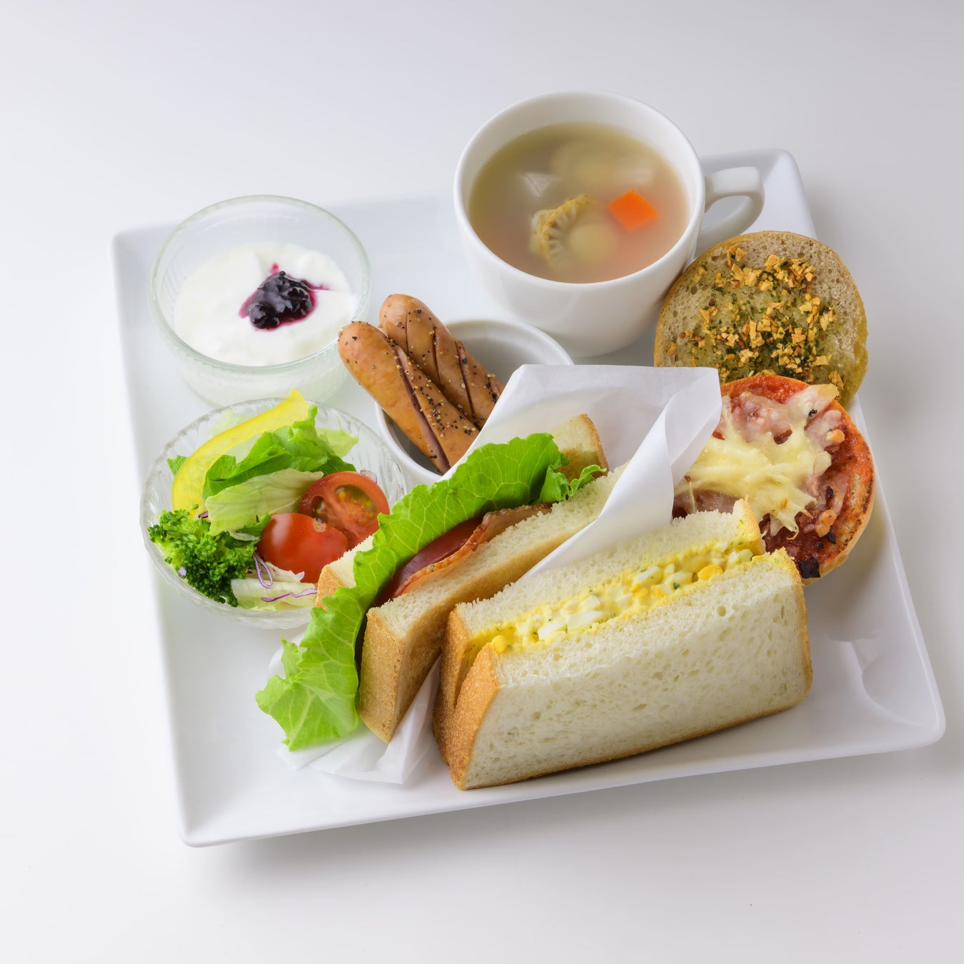 今月は、青森県大湊地方隊大湊警備隊の多用途支援艦『すおう』より艦メシ「サンドイッチセット」を紹介します。サンドイッチ2種、ミニトースト2種、ホタテスープにウインナーソテーやサラダなど、おいしさ、楽しさ、栄養がいっぱいの満足メニューです。