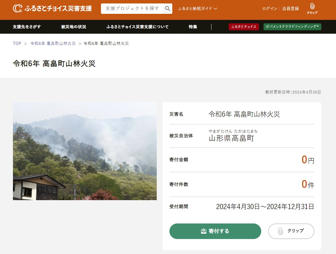 □■ 「ふるさとチョイス 災害支援 令和6年 高畠町山林火災」の概要 ■□