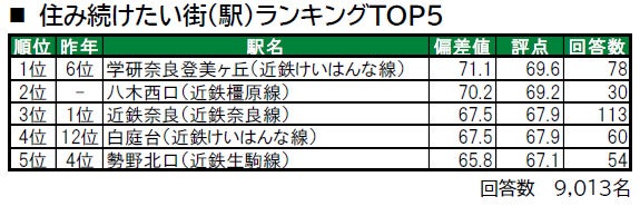 ●昨年から順位を上げてトップ10入りした駅は、4位生駒市に位置する白庭台(昨年12位)、7位橿原市に位置する橿原神宮前(昨年11位)、9位天理市に位置する天理(昨年29位)です。